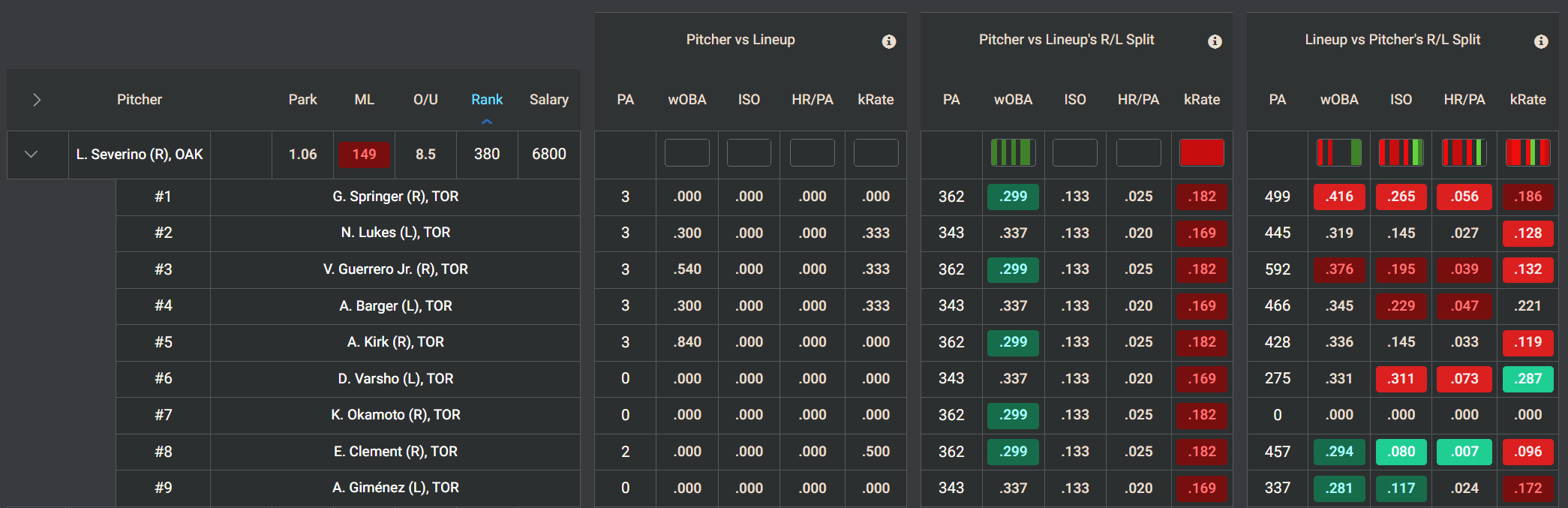 Gausman is a quality arm, but he did struggle in two starts against this group last season. Across 57 plate appearances versus the current A’s roster, he allowed a .340 AVG and .370 wOBA with just a 19.3% kRate. He also turned in a shaky spring (6.03 xFIP, 1.50 WHIP), which at least raises some concern heading into this matchup. Backing Gausman will be a solid Blue Jays bullpen, but there’s still appeal in using a two- or three-man A’s mini stack here, especially if they come in at low ownership.