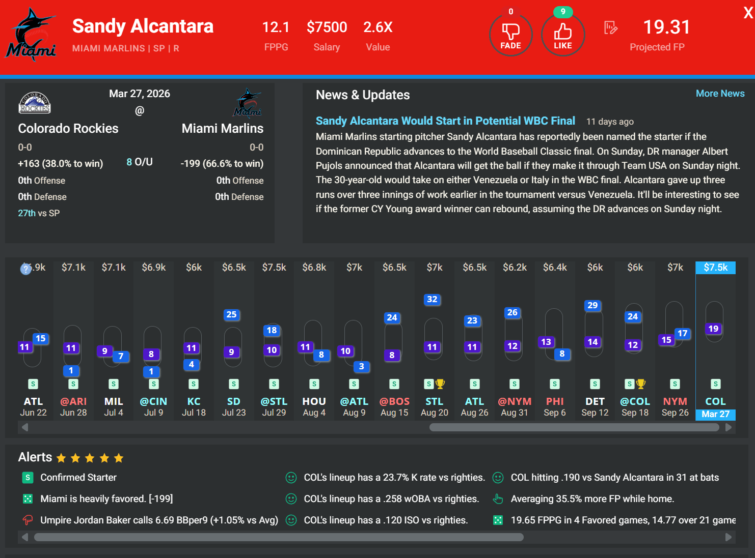 Sandy Alcantara (RHP), MIA | DK: $7.5k, FD: $8.9k | vs. COL