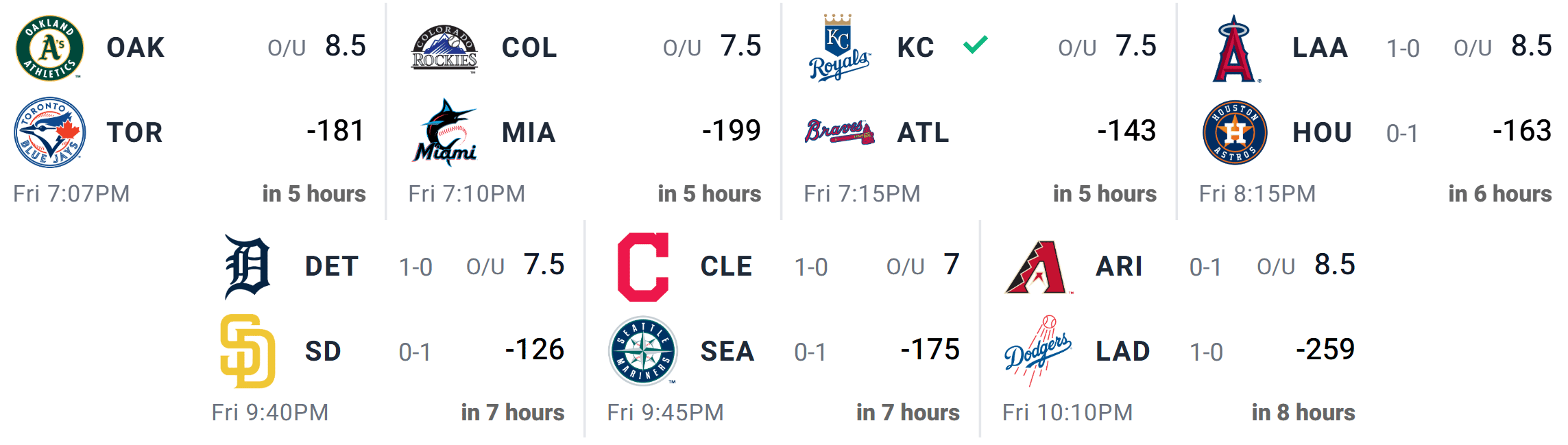 Our first MLB Friday slate of the season is here, and we land in what I’d consider the sweet spot with seven games on the board. The Opening Day vibes are still hanging around as six teams (A’s, Blue Jays, Braves, Royals, Marlins, and Rockies) will be playing their first game of the season tonight. Yesterday was a ton of fun, so let’s keep the good times rolling. Best of luck!