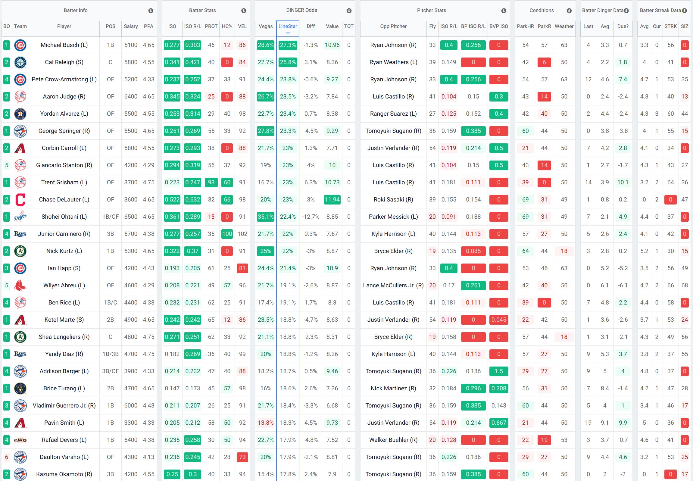 Disclaimer: Stacking in MLB DFS is not a requirement but it is a very common strategy used to take down GPPs. This strategy is covered in more detail in the MLB DFS strategy guide linked in the header at the top of this newsletter. Check out the MLB StackFinder on LineStar.