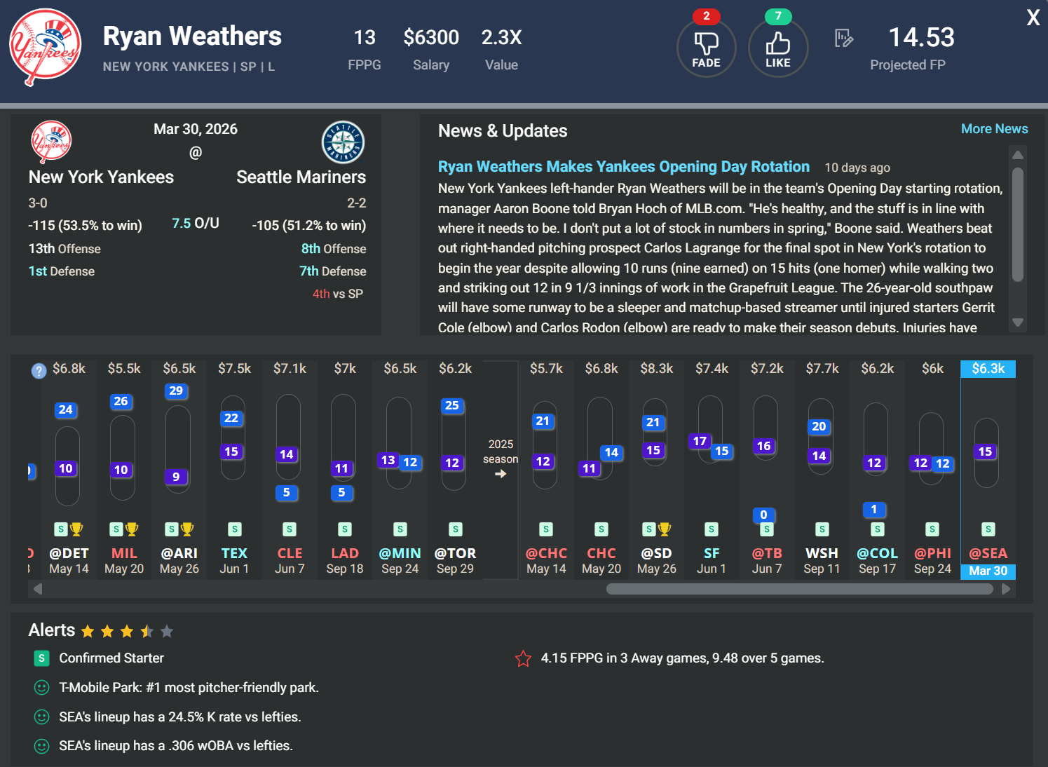 Ryan Weathers (LHP), NYY | DK: $6.3k, FD: $8k | at SEA