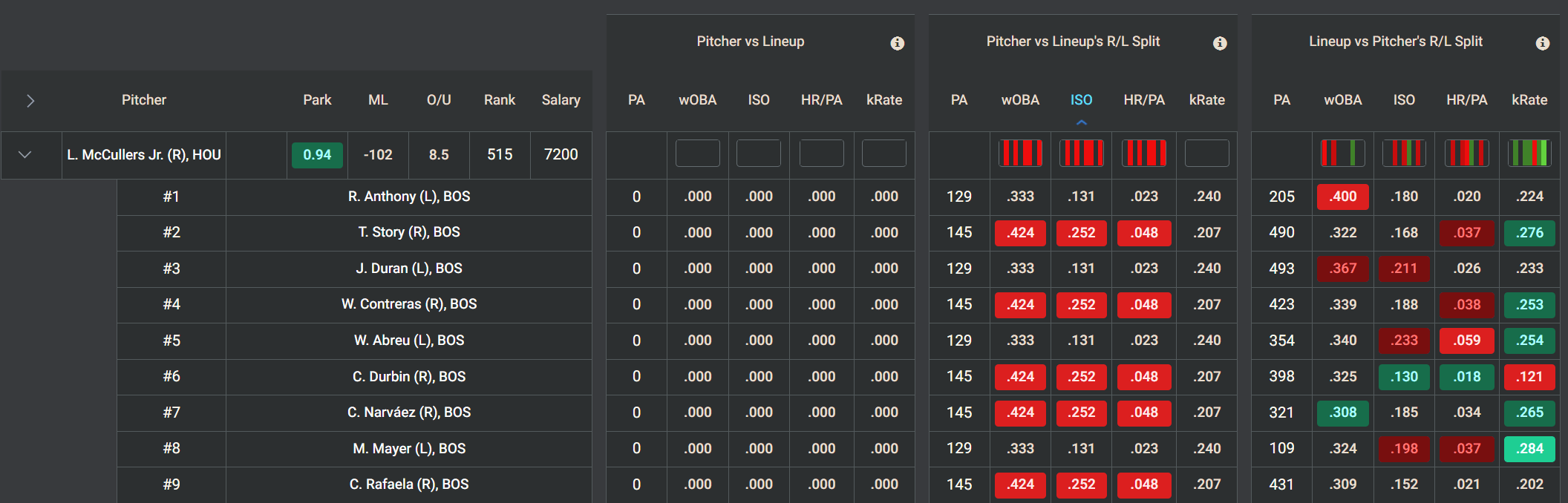 The Cubs have already shown some upside early, including a 10-run game against Washington on Saturday. Six projected hitters in today’s lineup posted at least a .170 ISO against RHPs last season, giving this lineup plenty of power throughout. Chicago leads the slate with a 5.4 implied total – a half-run higher than the next closest team – and they don’t project to be overly popular, with only Michael Busch and Alex Bregman currently sitting above 10% ownership. That combination of upside and modest ownership makes them one of the more appealing stacks on the board.