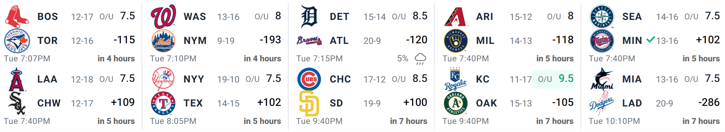 KC at ATH (9:40 ET, 9.5 O/U): Low-70s with light winds OUT to left/center. Nothing extreme, but still favorable hitting conditions in an already hitter-friendly park. This is the only game on the slate with an over/under above 8.5 runs.