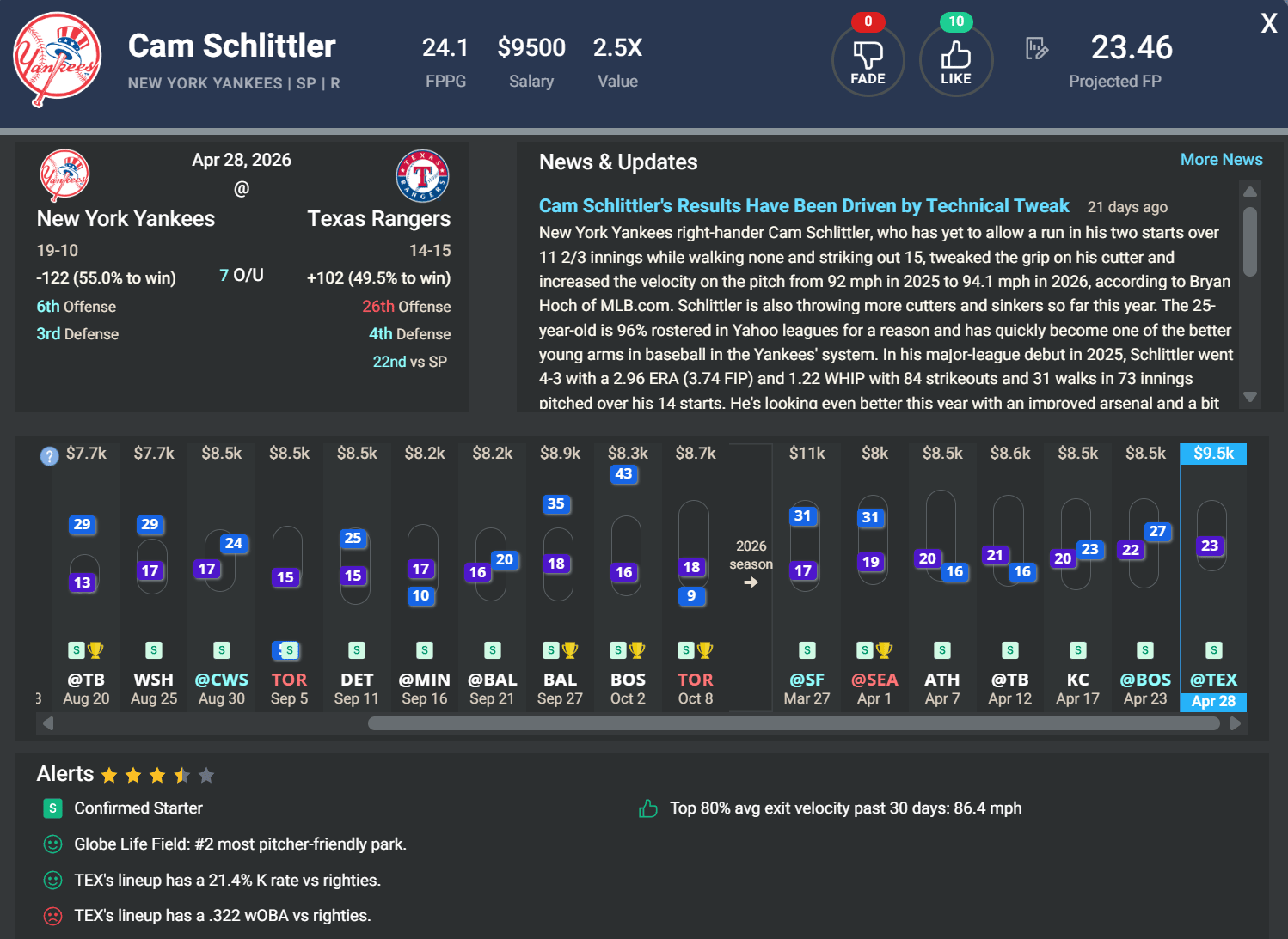 Cam Schlittler (RHP), NYY | DK: $9.5k, FD: $10.8k | at TEX
