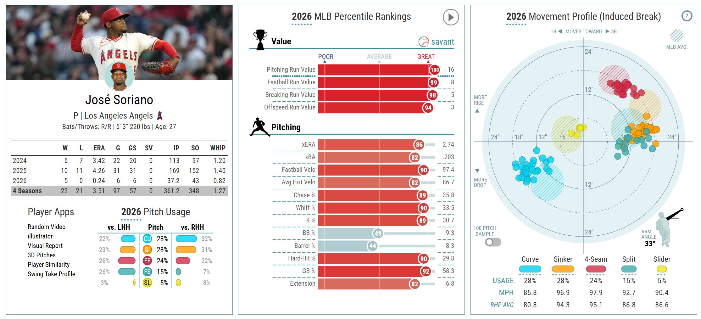 Not entirely sure what DraftKings is doing keeping Soriano under $9k. If the season ended today, he’d likely be the AL Cy Young frontrunner. Across 37.2 innings, he’s allowed just one run (0.24 ERA), coming on a solo shot by Drake Baldwin back on April 6. Some regression is inevitable, but not to a concerning degree. His 2.71 xERA and 2.83 xFIP both support the elite run prevention, and he’s paired that with a 0.82 WHIP, 30.7% kRate, and an excellent 57.8% ground-ball rate. I don’t usually include Baseball Savant visuals, but the percentile profile below speaks for itself. If you look toward the right of that image, you’ll also notice that he’s bringing well-above-average velocity across all five of his pitches.