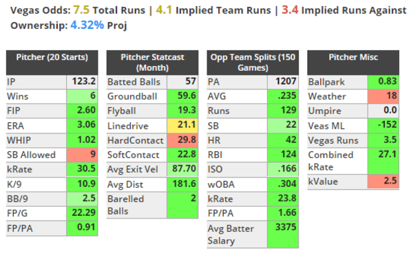 Hear me out on this one. I’ve officially placed the Mets in the “our season is over category” after they placed Cespedes on the disabled list this week for the rest of the season and then traded away Asdrubal Cabrera just minutes before first pitch last night. Just like the Orioles I will be attacking this lineup often with pitching and on a night like tonight, with limited options available to us, using Williams here makes sense. He’s flashed a 30+ point DraftKings ceiling this season with a 31 fantasy point performance against the Brewers back on June 18th. He’s also coming off of two strong starts against tough competition. Against the Nationals he went five innings, allowing four hits and zero earned runs with three strikeouts and picked up the win. Against Cleveland he went six innings allowing four hits and zero earned runs again while picking up the win and the quality start. The downside here, and it’s a big downside, is the strikeouts. He only has a 16.4% strikeout rate and a 7.3% swinging strike rate which are both very bad. But, the Mets are striking out 21.7% of the time and they will likely be replacing Cabrera in the lineup with someone who strikes out at a higher rate, providing an additional boost. This is far from a sure thing and isn’t an exciting pick at all but with Cueto, Gonzalez, and Gausman all likely getting more attention in this price range I wanted to highlight someone who’s likely going to be under 5% owned that I think can produce similar results if everything falls in his favor. I believe he can eat up innings, keep the runs to a minimum, and hopefully get somewhere in the neighborhood of five or more strikeouts against this very weak lineup. Roster him at your own risk, but consider him my wildcard option of the day.