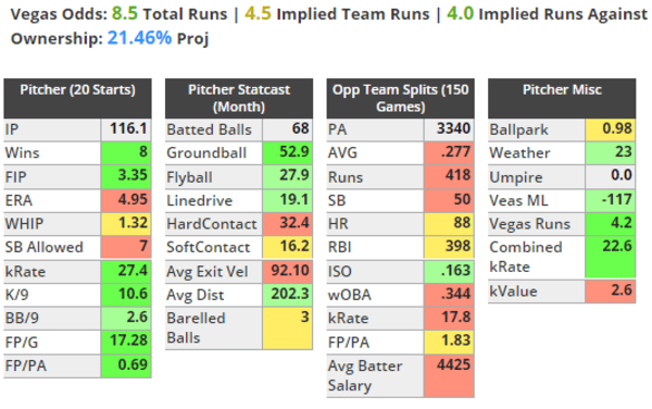 Gaviglio is a roller coaster ride. We never know which guy is going to show up. But on a slate like this, everyone else is basically in the same boat, so I’m really not looking for floor plays. His last two starts were a bit more encouraging and he showed a solid ceiling as well. He went 5.2 innings against Seattle, allowing just three earned runs and getting seven strikeouts. Then he followed that up going 5.1 innings, allowing just one earned run and getting another seven strikeouts. He has multiple games with seven or more innings and seven or more strikeouts on the season. He also has multiple games with four or less innings or two or less strikeouts. I realize most of this information is based on very small sample sizes but I’m trying to find potential upside through the sea of less than ideal options today. On the season, he has a respectable 4.02 SIERA with 22% strikeouts. He’s solid against righties, allowing only a .167 xISO and .327 xwOBA but he struggles with lefties giving up a .234 xISO and .359 xwOBA. That actually works out well today since the few threats in the Royals lineup are more right-handed than left-handed. It’s a great matchup against the Royals who have an abysmal .135 ISO, .295 wOBA, and 83 wRC+ against right-handed pitching. Gaviglio and the Blue Jays are solid -129 favorites. The Royals implied total is 4.5 runs, which is much higher than I’d typically want to see when rostering a pitcher, but that’s just how this slate breaks out. Don’t be surprised if he gives up some runs, but he should be able to back it up with enough innings, strikeouts, and the win to give you a good enough fantasy outing.