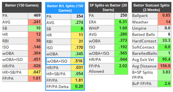 This is certainly not the season the Padres were hoping for when they signed Hosmer in the offseason, but he's worth more in this matchup than the price tag he has today. The power is down against right-handed hitting with a .162 ISO but his .344 wOBA and 36.6% hard-hit rate are still solid.